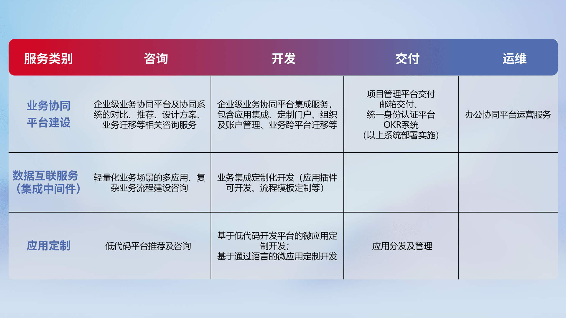 针对钉钉、、企微、、、、IDaas等平台级产品提供产品的规划、、、方案、、、、交付、、、定制化开发等服务,,实现如统一协同办公、、、智能客户服务、、、、混合会议管理、、、智能数据查询、、、、等业务场景,,,实现数字化转型。。。