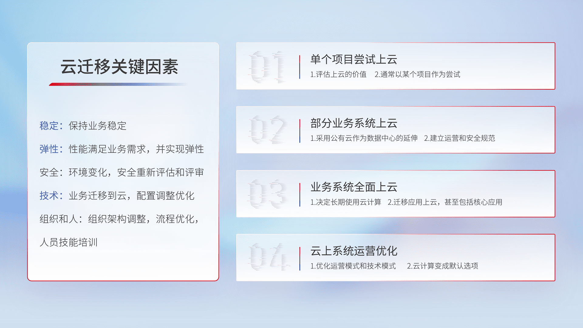 结合实际业务,,,,从规划设计、、云平台选型、、云原生改造、、、、数据迁移、、、、集成交付,,,迁移全过程为客户识别最佳上云路径,,做好风险识别管理,,设计网络架构、、、、身份权限、、、、安全审计合规、、、、操作审计、、、日志审计、、、监控告警策略、、多站点容灾设计等,,对云上基础设施进行整体规划,,,提升IT治理水平,,,以满足弹性、、、高可用、、、、高性能的需求。。